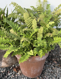 - Funkior, Hosta, vars lugna blad harmonierar med lurvbräkens flikiga